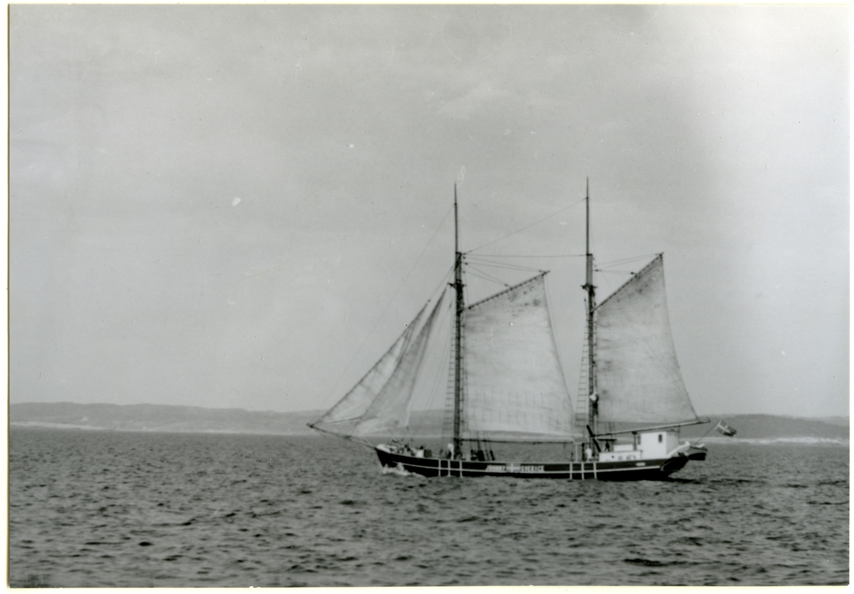 [från fotobeskrivning:] "Galeasen JOHNNY utanför Hallandskusten i juni 1940." "UNDERSÖKNINGSRESOR. Fil. lic. Gunnar Jonssons undersökningsresa till Västkusten juni 1940." [---]