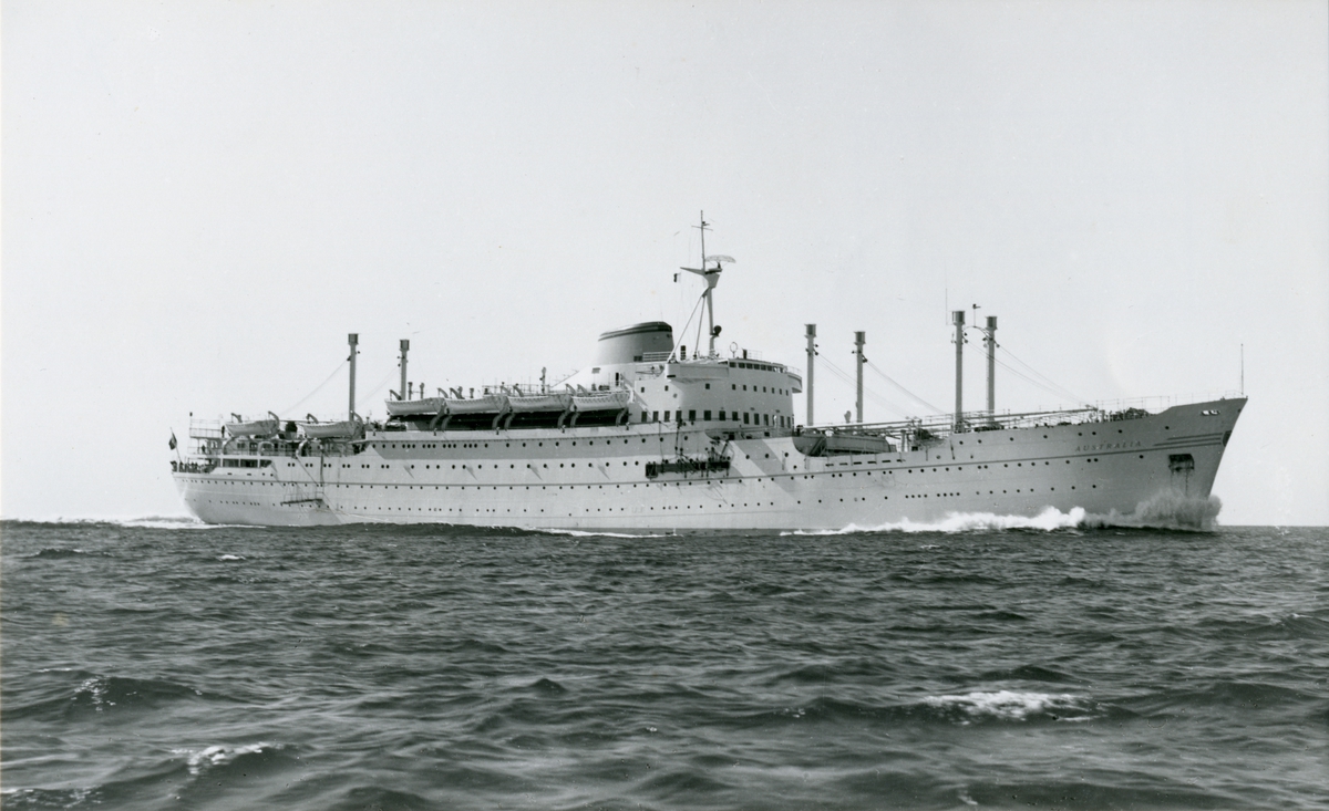 Foto från 25/11 1955 visande turist-&passarerarmotorfartyg AUSTRALIA av Genua under gång.