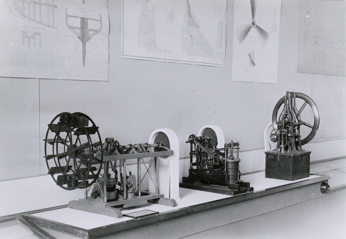 Tillfälliga utställningen "Varv och skeppsbyggeri", 1800-talsavdelningen. Modell av ångmaskin för hjulångare. Modeller av stående sjöbalansmaskiner från 1840-50-talet.