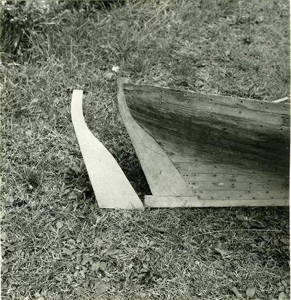 Detalj av aktern på av miniatyrmodellen med en mall av papp till dess akterstäv. Christian Madsens båtbyggeri. Foto N(ils) Nilsson aug (19)64. Danmark, Själland, Lynaes.