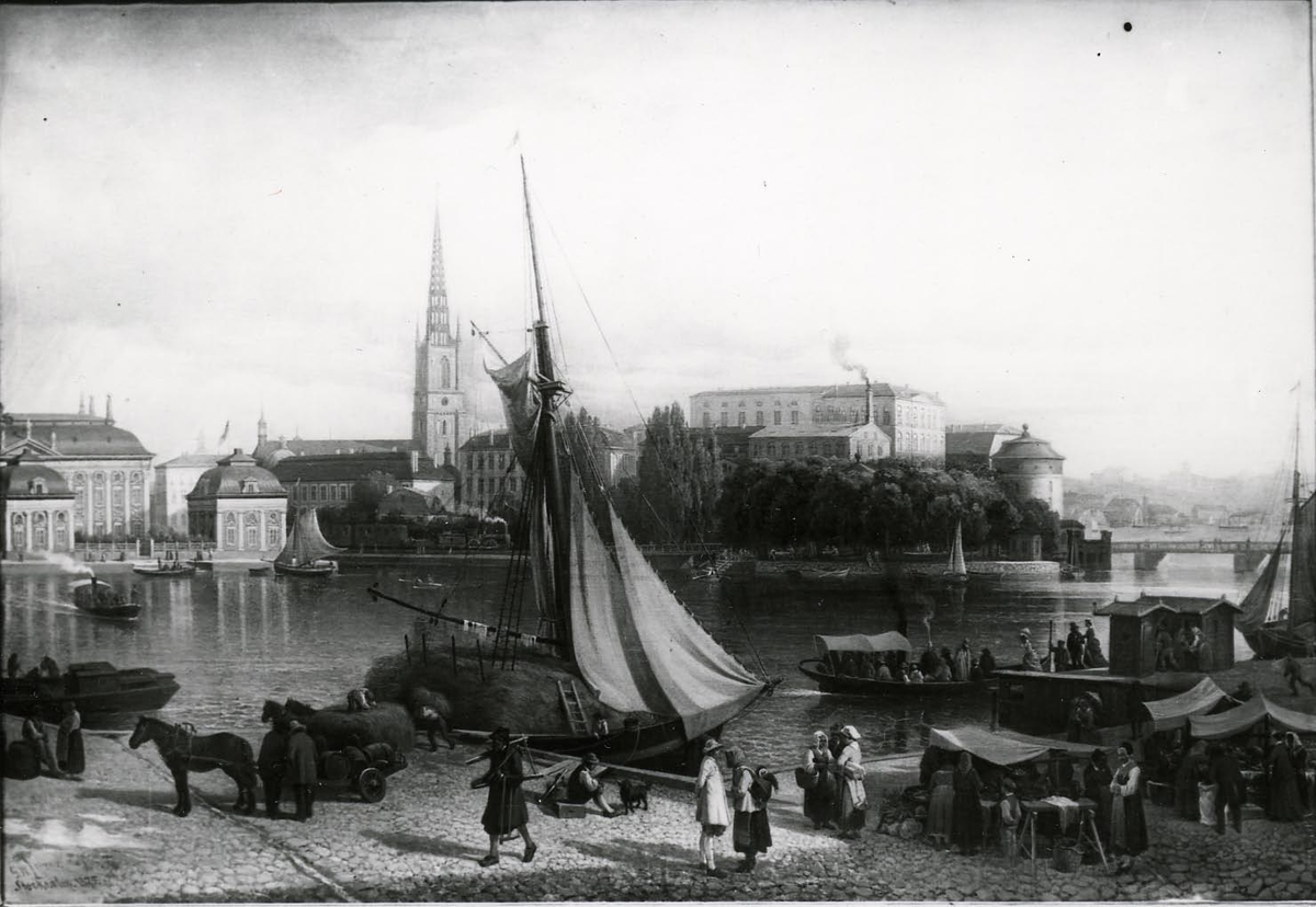 Utsikt från Rödbotorget. Höskuta på strömmen med Riddarhuset, Riddarholmskyrkan och Strömsborg i bakgrunden. Oljemålning sign.: G.W. Pinzit Stockholm 1875.