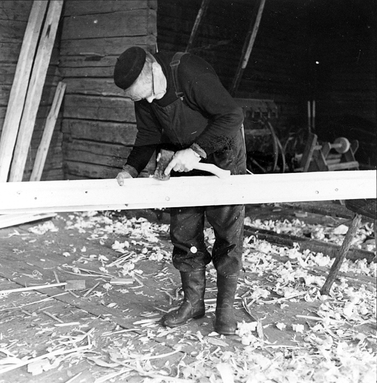 Neg nr 33. Johan Larsson justerar kölen med en yxa. kölen ligger på kant över båtbockarna. Foto 6.8 (1962).
