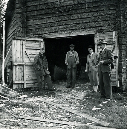 Båtbyggare Leander Sjögren i porten till den rundloge, där han har sin båtbyggarverkstad och omgiven av kand. Rolf Vallerö, landstantikvarie Gunnar Westin, Umeå och intendent A. Westerlund, Skellefteå.