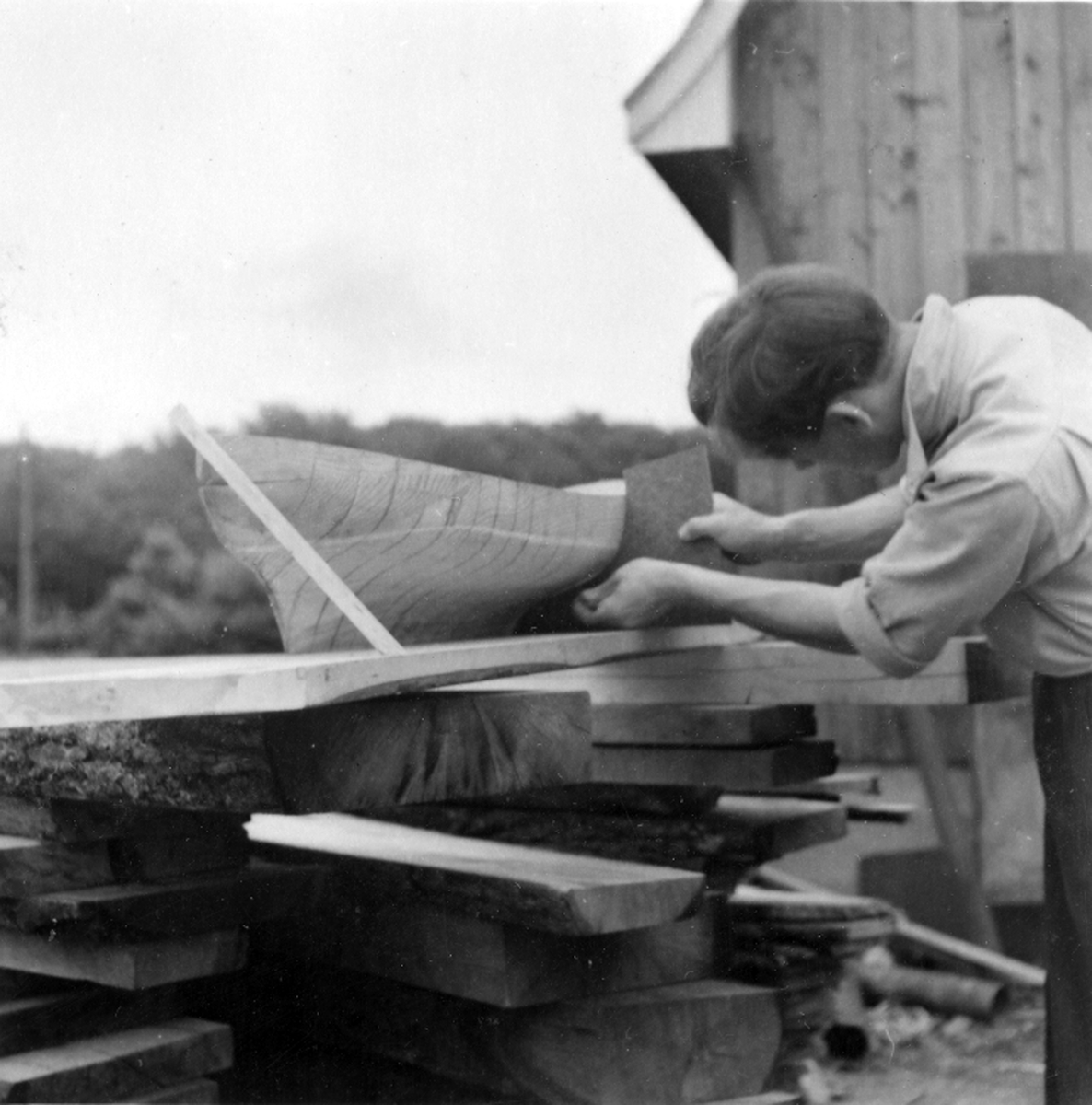 Hugo Olssons varv. Båtbyggare Inge Olsson demonstrerar hur han efter spantmodell gör spantmallar och efter dem ritar upp spantruta till ett kravellbygge.