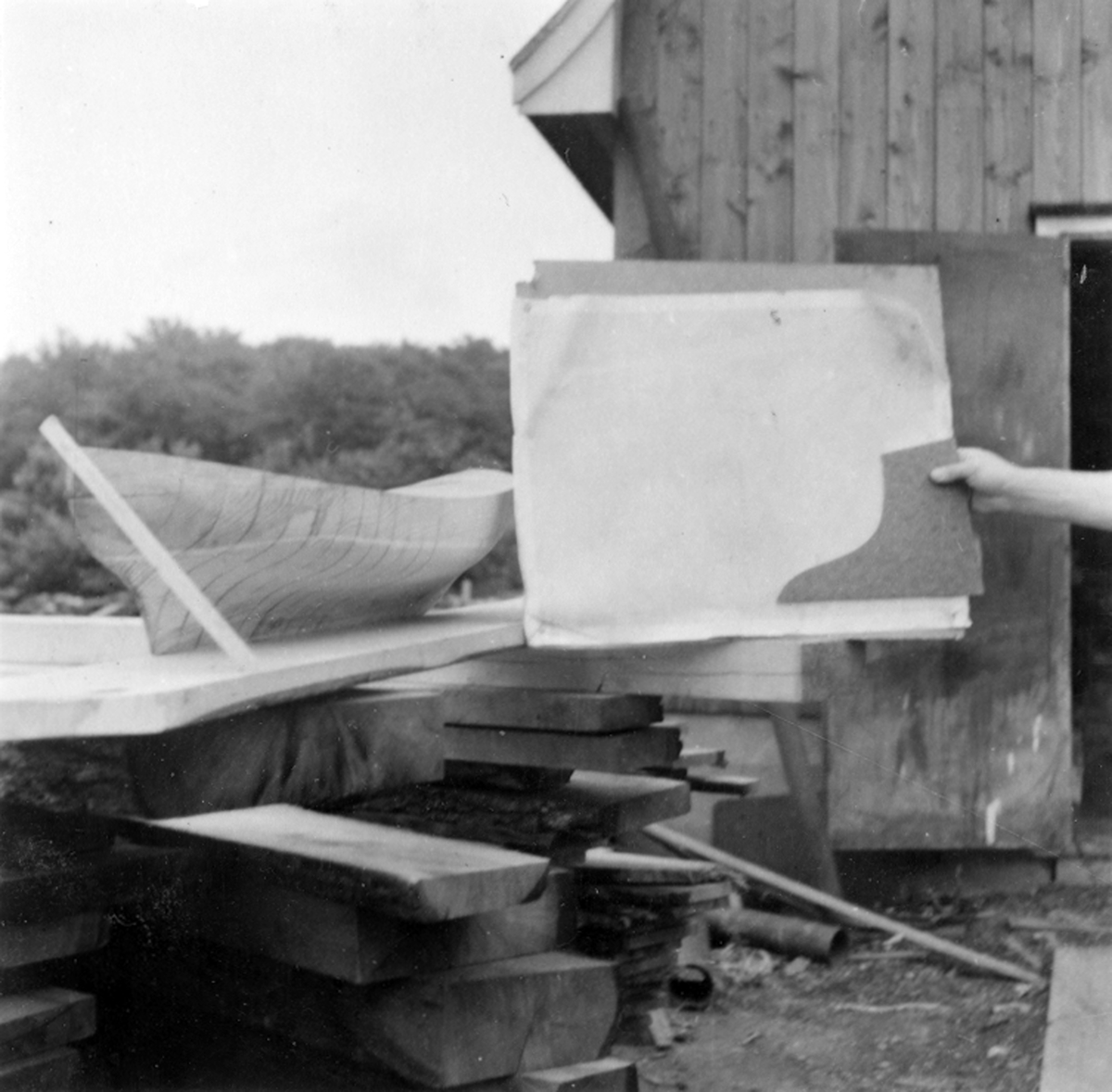 Hugo Olssons varv. Båtbyggare Inge Olsson demonstrerar hur han efter spantmodell gör spantmallar och efter dem ritar upp spantruta till ett kravellbygge.