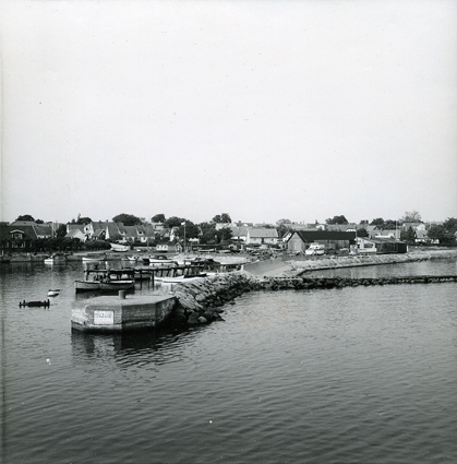 Södra hamnarmen från väster. Pålbryggan är varvets gamla utrustningskaj. Skjulet på kajen längst ut till höger är varvets byggskjul för småbåtar. (se uppt. "Vikens skeppsvarv") Skåne, Malmöhus län, Viken.