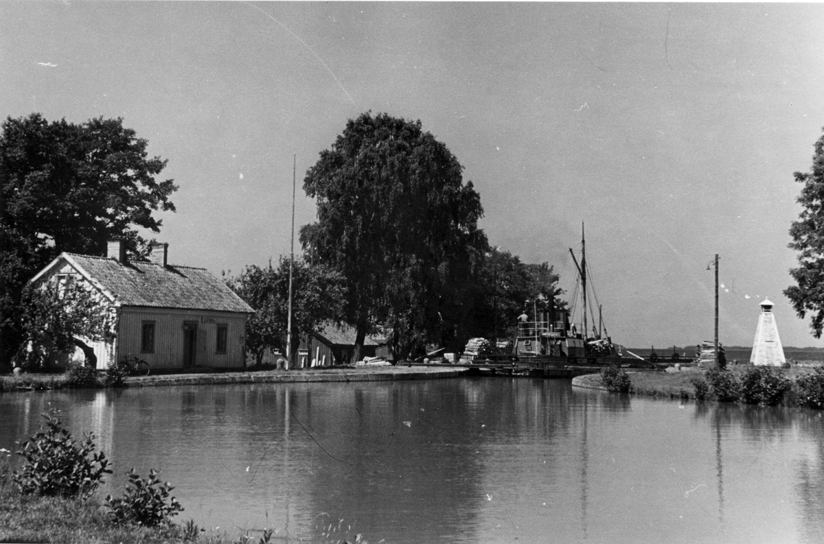 Ett fartyg vid sluss i Sjötorp längs Göta kanal. En ledfyr till höger i bild.
