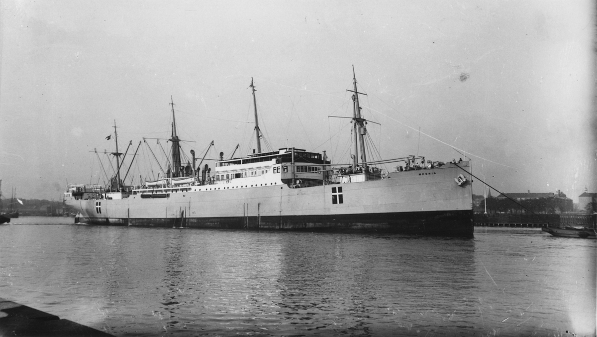 Foto i svartvitt visande last-& passagerarmotorfartyget "MEONIA" av Köpenhamn under bogsering i Köpenhamn 1939-40.