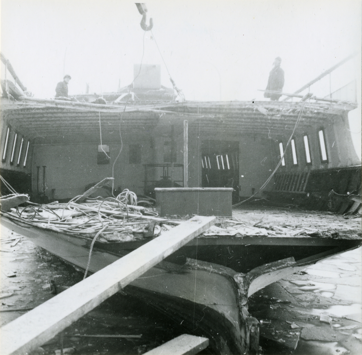 Titel: Fartyget liggande vid Hammarbyvarvet under nedskrotning 14/1 1961