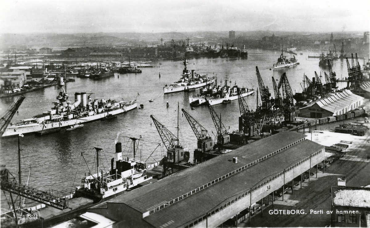 Vykort föreställande Göteborgs hamn. Enheter ur flottan under besök i Göteborgs hamn på 1930-talet.