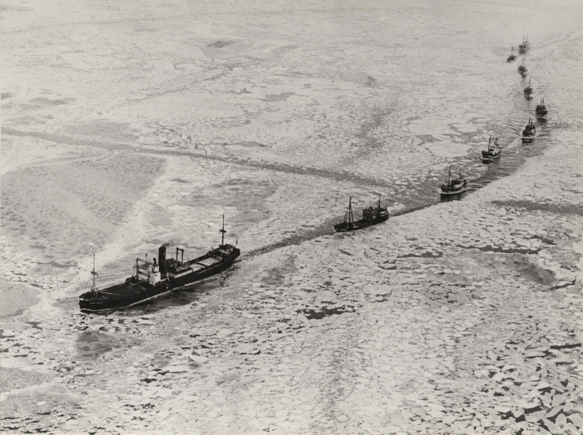 Det ryska lastångfartyget SEVEROMORSK av Leningrad ledande en iskonvoj i Öresund i januari 1963.