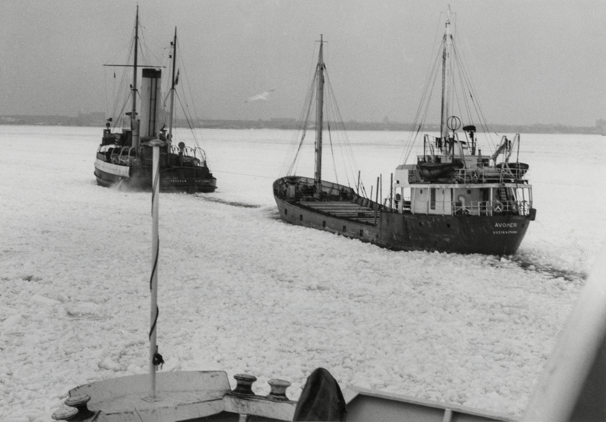 Den danska isbrytaren VAEDEREN av Köpenhamn bogserar det finska motorfartyget AVOMERI av Nystad. Öresund 1963.