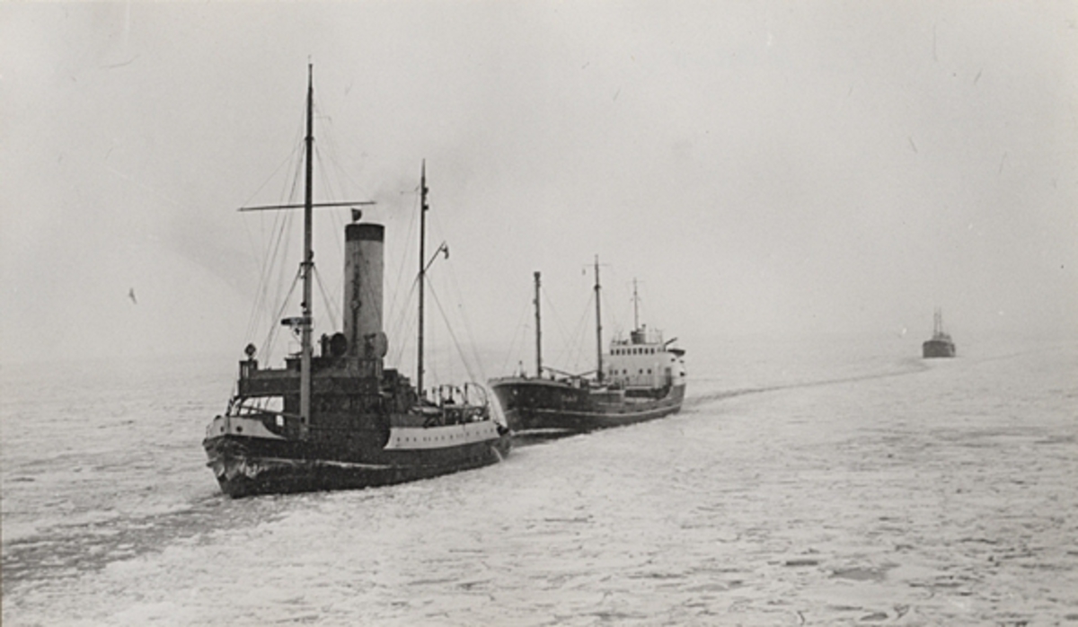 Den danska isbrytaren VAEDEREN av Köpenhamn assisterar det västtyska lastmotorfartyget CLAUS samt annat okänt fartyg i Öresund 1963.