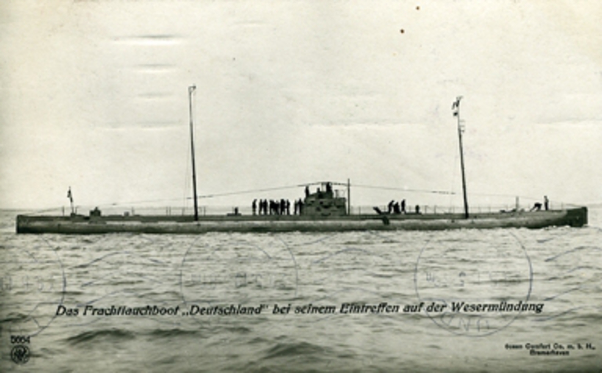 Tyska handelsubåten DEUTSCHLAND vid floden Wesers mynning. Vykort.
