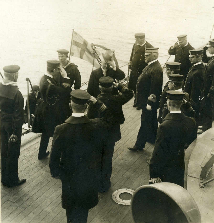 På Hårsfjärden 1912. Sjöminister Jakob Larsson med adjutant går ombord. Han mottages av chefen Kom.kapt. I. Nordenfeldt och i närvaro av eskaderchefen amiral C.A. Ehrensvärd samt amiral W. Dyrssen och Kmd. H. Krusenstierna tillsammans med fyra sjöministrar.