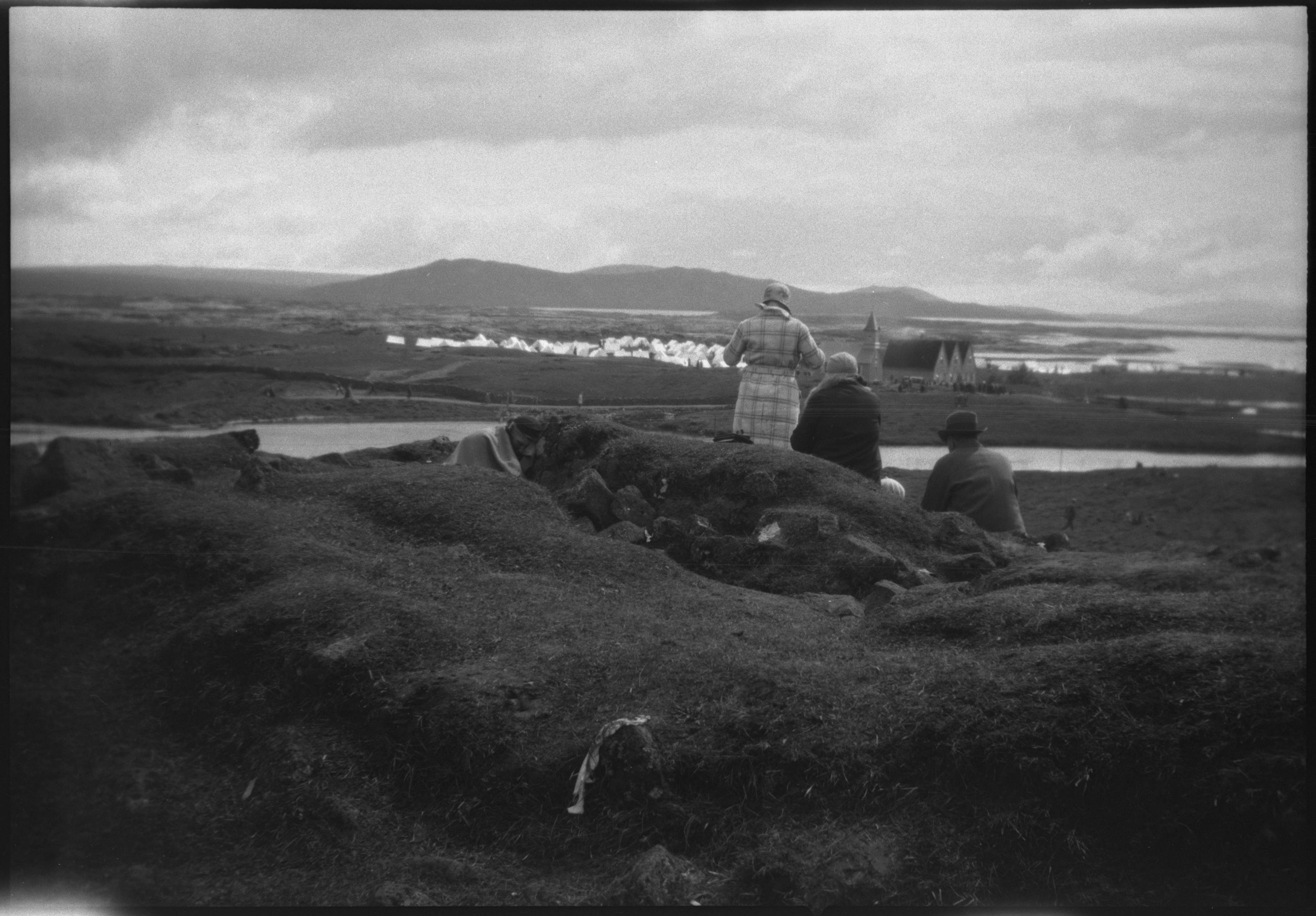 Tingvalla. "Gammal hustomtning, Snorres hus vid Althingsplatsen, kyrkan och prästgården synas".