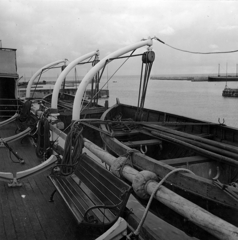 S/S Drotten av Visby. Övre promenaddäck eller båtdäck med de i de utsvängda dävertarna hängande livbåtarna. Fil lic Gunnar Jonssons undersökningsresa till Gotland 1940.