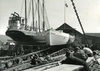 Holms skeppsvarv. Fiskebåten Västland (anm. felhört, hette Westland) under byggnad för Styrsö Tången, Bohuslän, 1951. Fyrmastskonaremn Else (RN 8342)från Skillinge under reparation.