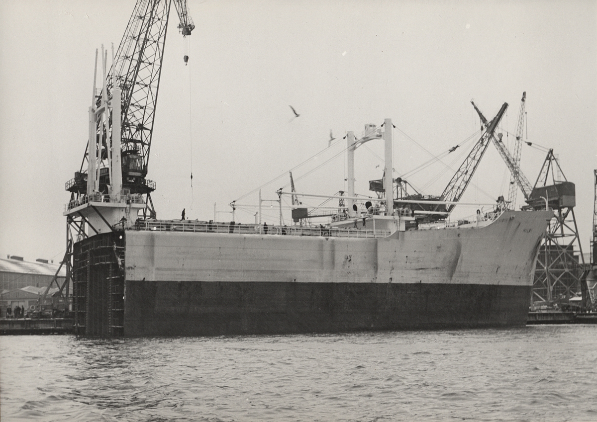 Förskeppet förtöjt vid Götaverkens kaj, medan midskeppssektionen blir förenad med akterskeppet efter förlängning i flytdockan.