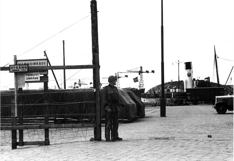 Tullhuskajen i Göteborgs hamn 1940. Hamnområdet är spärrat medels taggtrådstängsel och tillträde beredes behöriga personer endast vid vissa punkter, där tillträdet kontrolleras genom militärposter, utgående från landstormsförband. Fil lic Gunnar Jonssons undersökningsresa juni 1940.