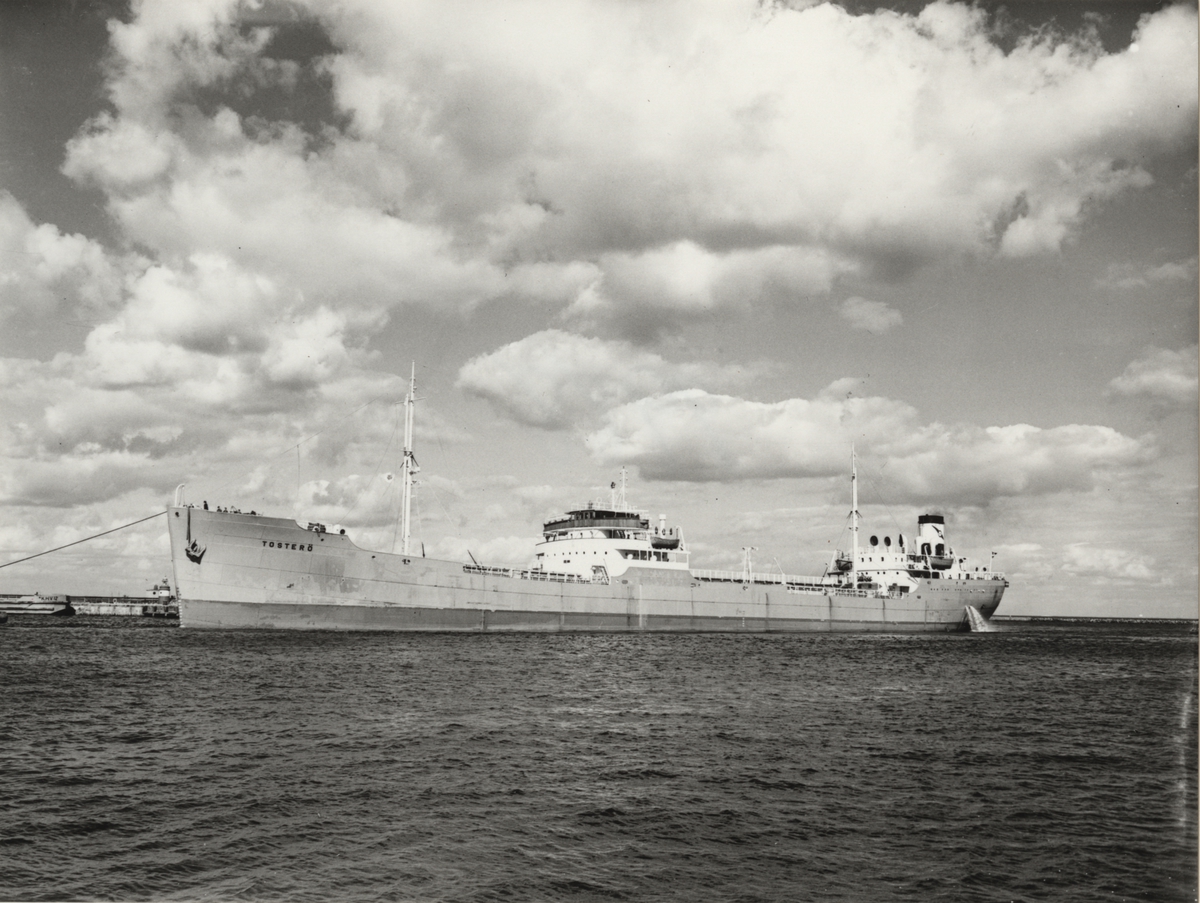 Foto i svartvitt visande tankmotorfartyget "TOSTERÖ" i Köpenhamn augusti månad 1958.