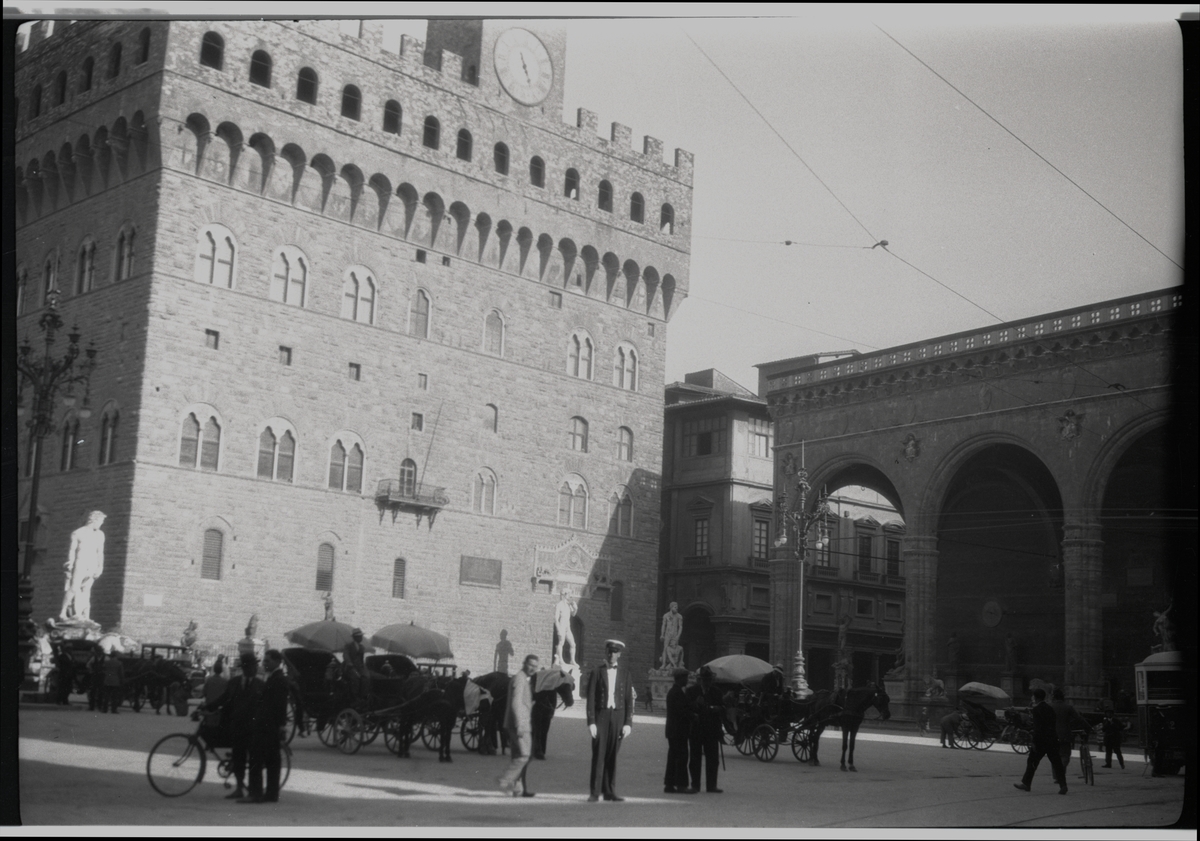 Svensk officer (möjligen Gunvald Berger själv) framför Palazzo Vecchio i Florens. Bilden har uppenbarligen tagits under pansarkryssaren FYLGIAs långresa 1925-1926, varvid bl a Genua angjordes.