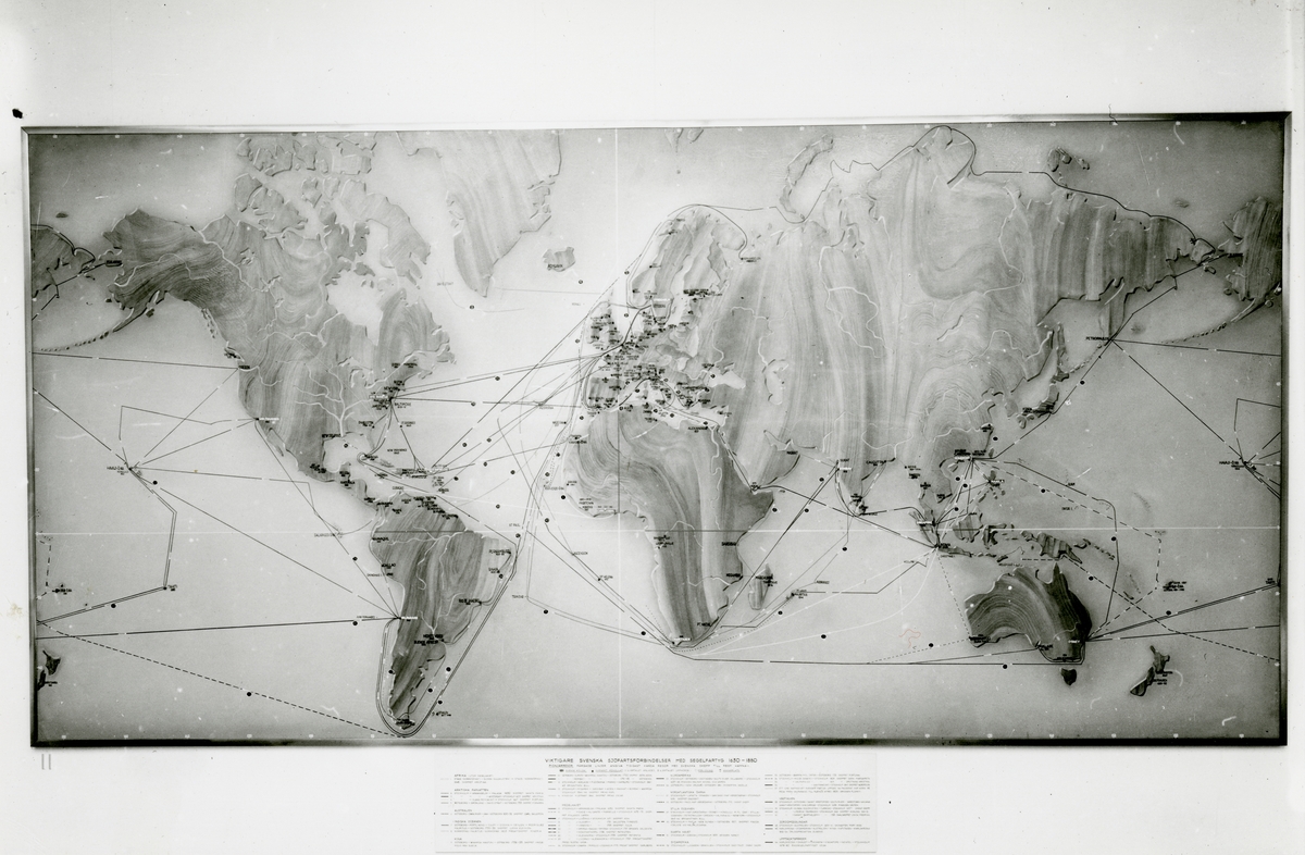 Utställning i Sjöfartsavdelningen. Karta nr. 2 i översiktsrummet visande "Viktigare svenska sjöfartsförbindelser med segelfartyg 16301880."