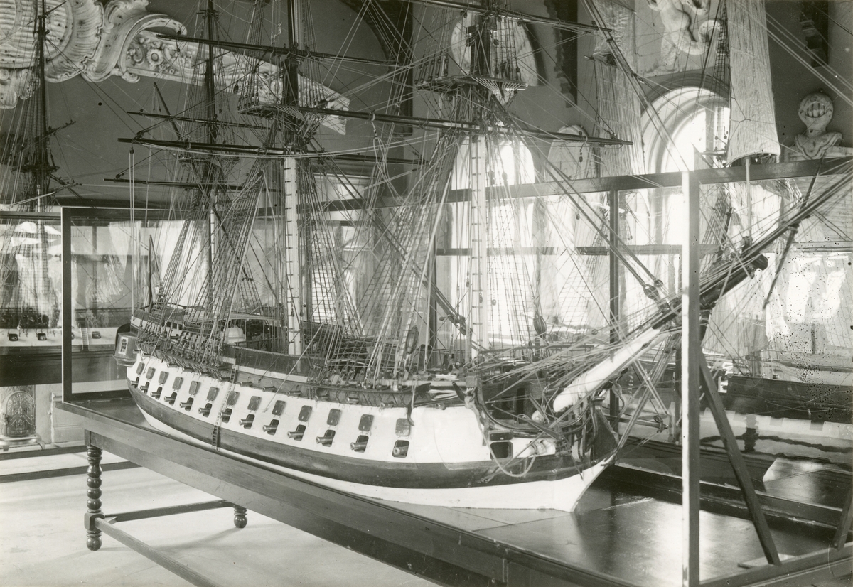 Marinmuseum på Strandvägen 58. Utställning i segelfartygsrummet. I förgrunden modell av fregatt av BELLONA-klass.