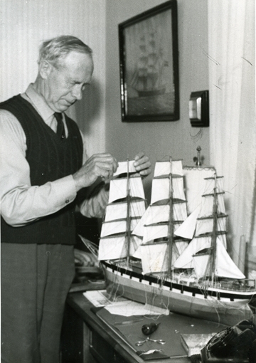 Sjökapten Axel Wallin, Svanshall, i arbete med sin egen modell av fullriggaren Edenmore i vilken han seglade matros år 1909 (se sjökapten Axel Wallins minnesanteckningar).