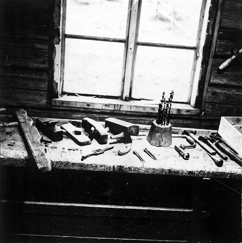 Neg nr 12. Båtbyggarens redskap: hyvlar med holkhyvel och "klöshyvel" längst th. Passare, borrar, borrsväng, syl, hammare, hovtång, nitnagel. Foto 24.8 (1962).