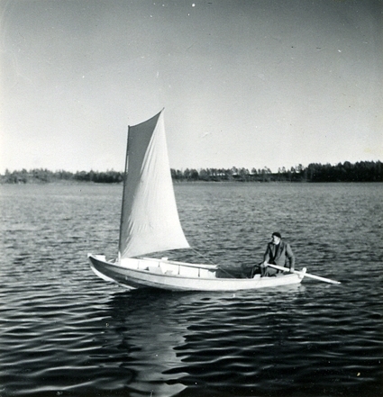 Handlande och båtbyggare Konrad Dalins "snugga", som han själv byggt. K.D. seglar sin "snugga". Ångermanland, Nätra tingslag och socken, Ulvö hamn.