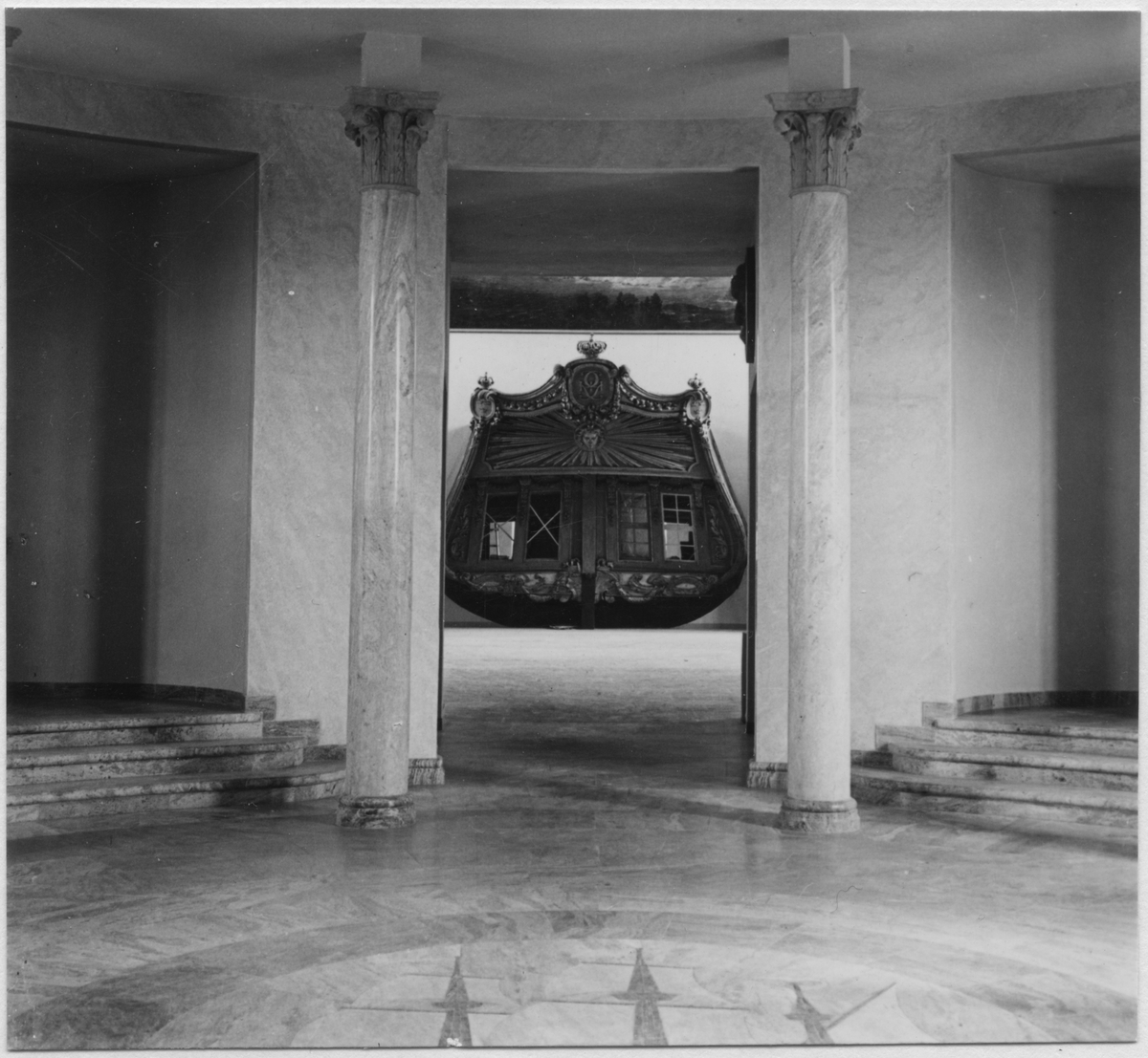 Entréhallen i Sjöhistoriska museet. I fonden syns Amphions akterspegel i trofésalen.