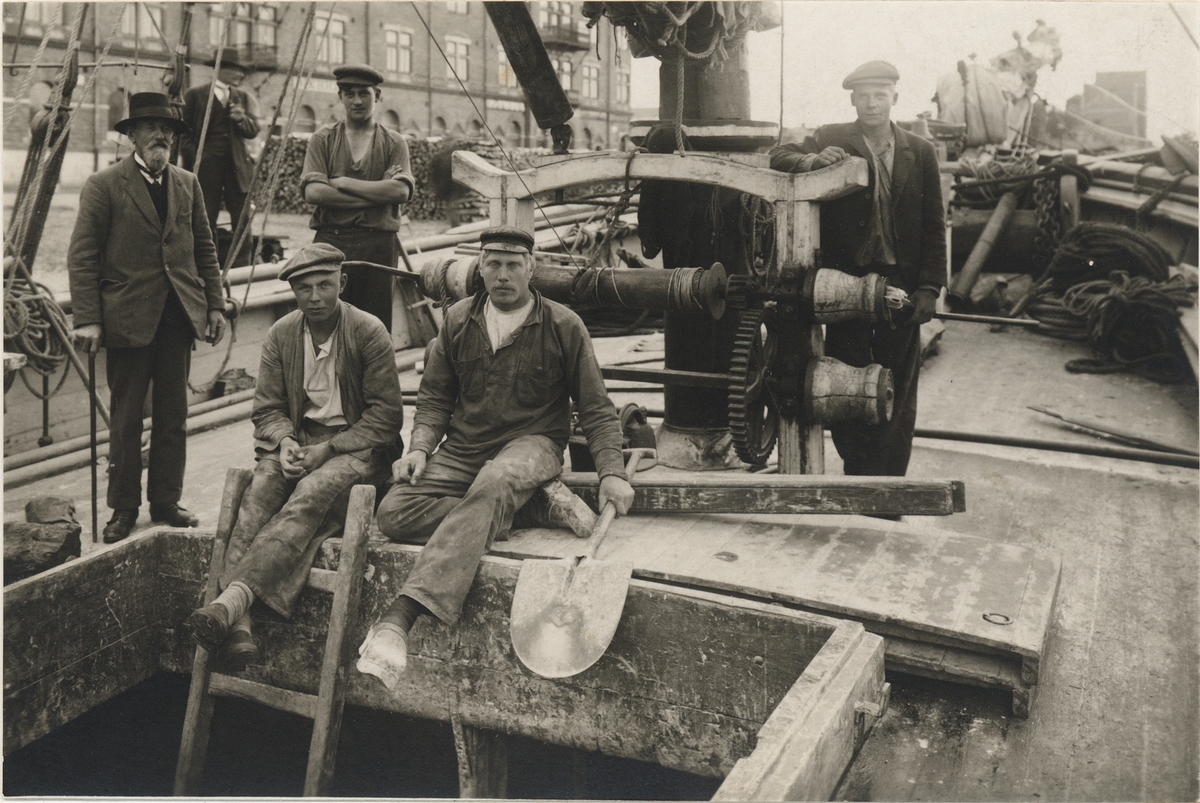 [från fotobeskrivningen:] "Besättningen ombord på galeasen AGIL av Karlskrona i färd med att lossa barlasten i Gävle 1916."