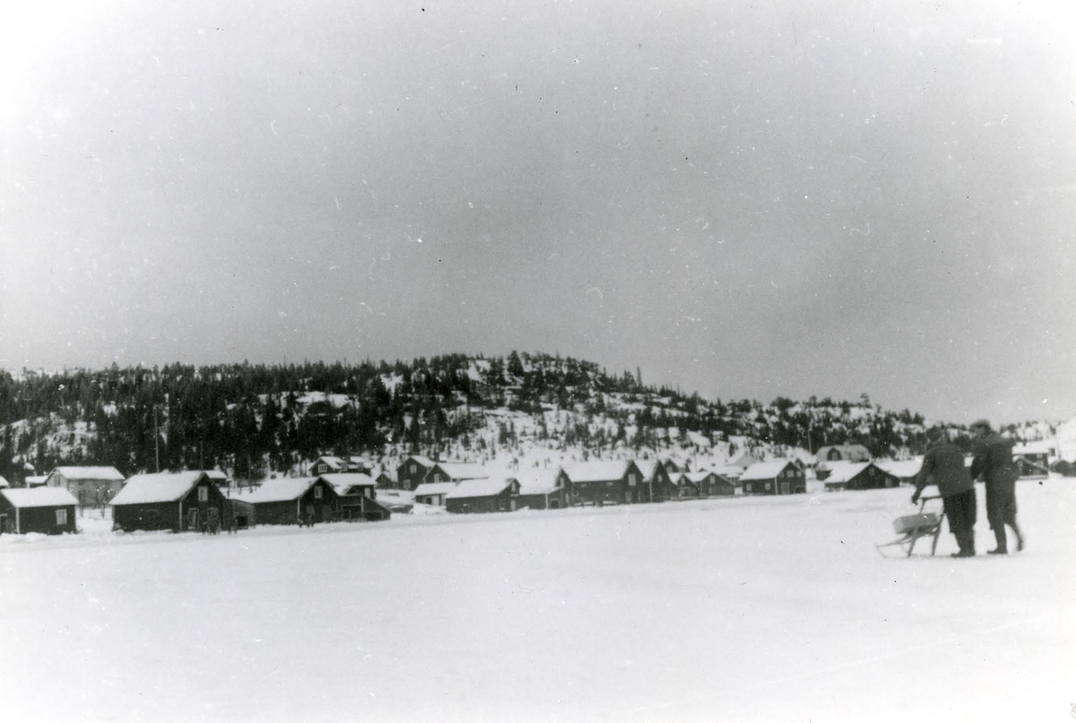 Ångermanland, Trysunda. Förnödenheter har kommit med båt i den brutna isrännan utanför Trysunda och fraktas den sista biten över isen med spark. Fotot från slutet av 1950-talet.
