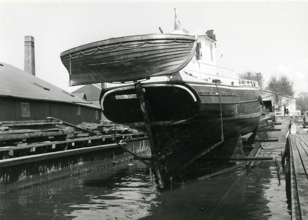 SJOLLEN vinschas upp. Märk ledstängerna akter låring, surrade i pollare.