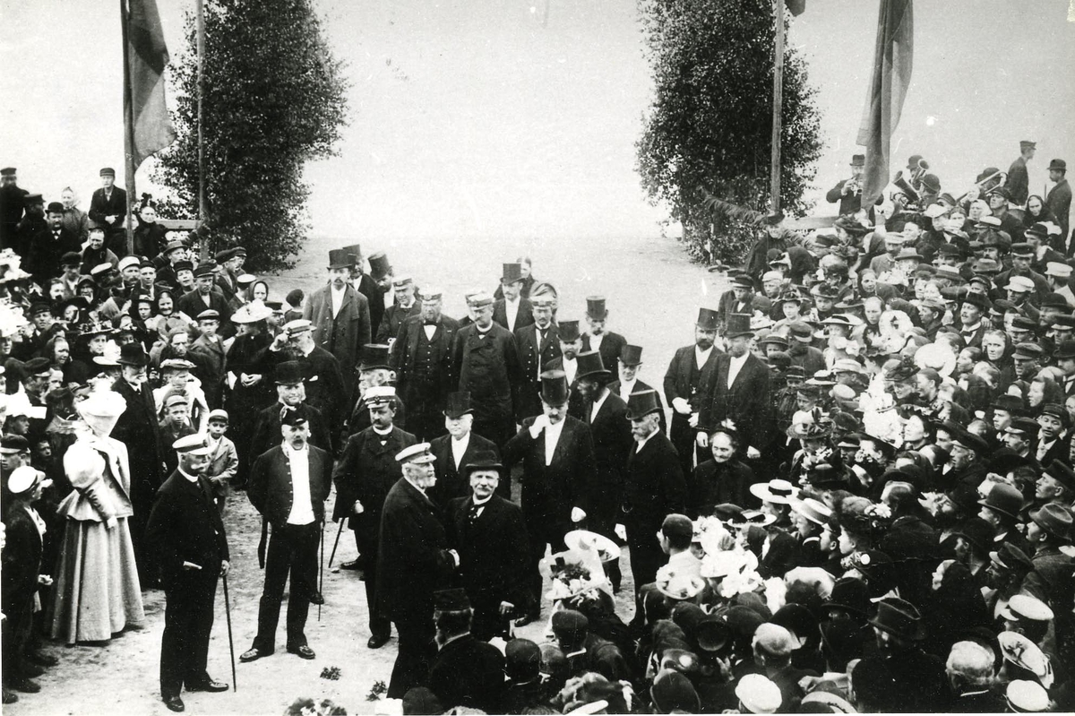 Strömstads Honoratiores hälsar kungen år 1896. Konung Oscar II och landshövding Cornelius Sjöcrona hälsar på varandra.
