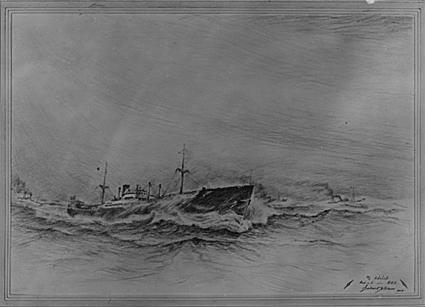 Lastmotorfartyget ADELSÖ av Stockholm. Kolteckning signerad Gerhard Albe, 1958.