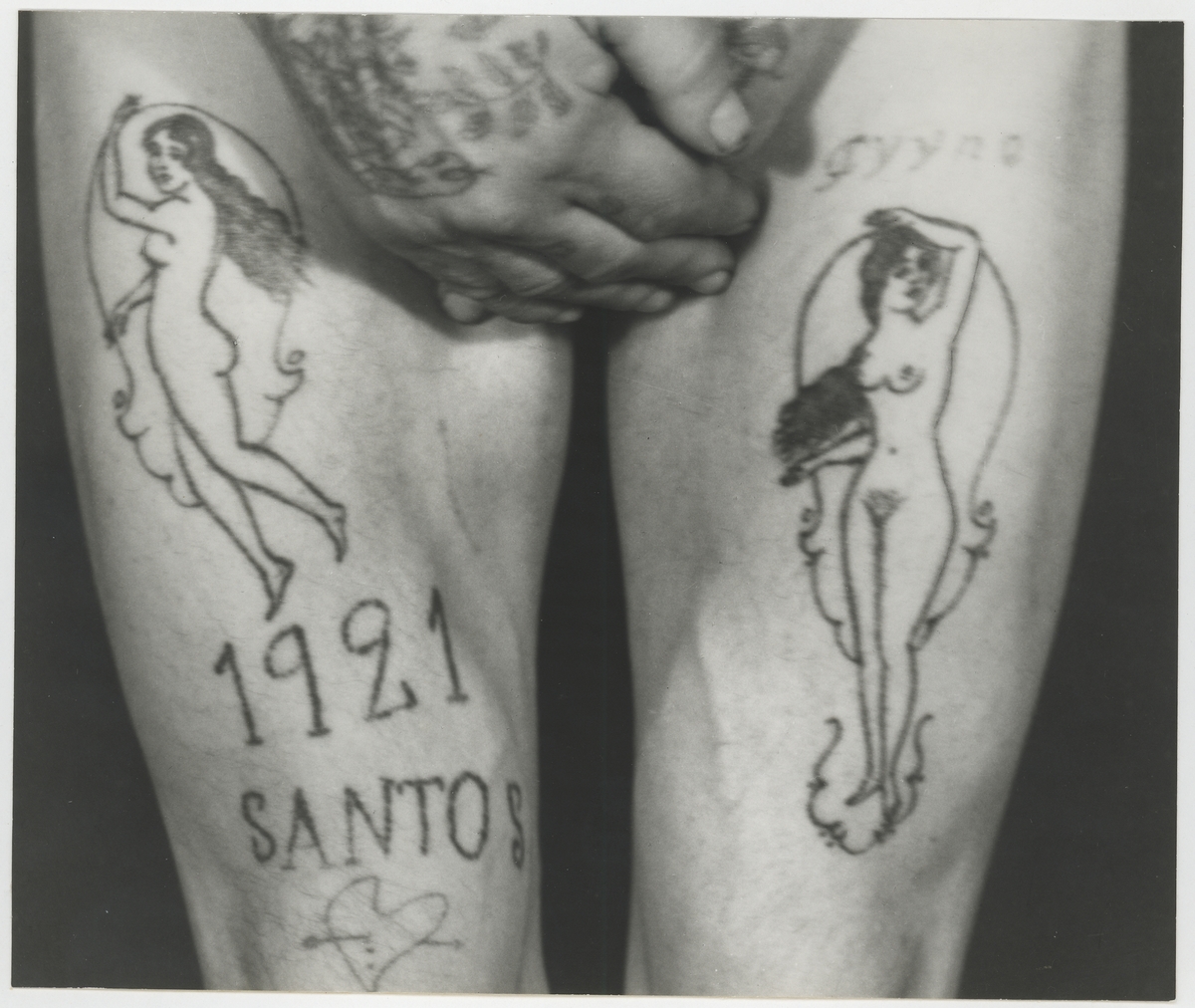 På vardera benet en kvinnobild. Tatueringen utförd i New Orleans till ett pris av 4 dollars.
