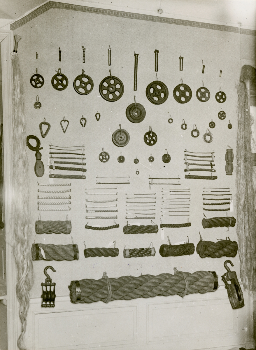 Utställning i Sjömanskapsavdelningen i Sjöfartsmuseum, Skeppsbron 46, Stockholm. Detalj ur tross-, block- och blockskivesamlingen.