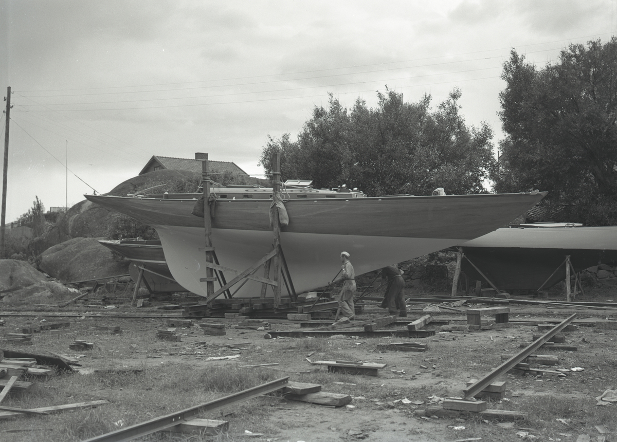 [från fotobeskrivningen:] "Sjösättningen av GULLVEIG II på Arendals båtvarv 1947. GULLVEIG (14,10 x 2,84). 65 kvm GULLVEIG 1947. Eril [sic] Salander foto 12 juni 1947."