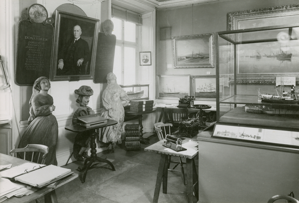 Utställning i Sjöfartsmuseum, Skeppsbron 46, Stockholm. Kontors- och expeditionslokaler. Äldre ångfartygsrummet apterat till arbetsrum för museets stab. På väggen skylt med skrift "Större donatorer".