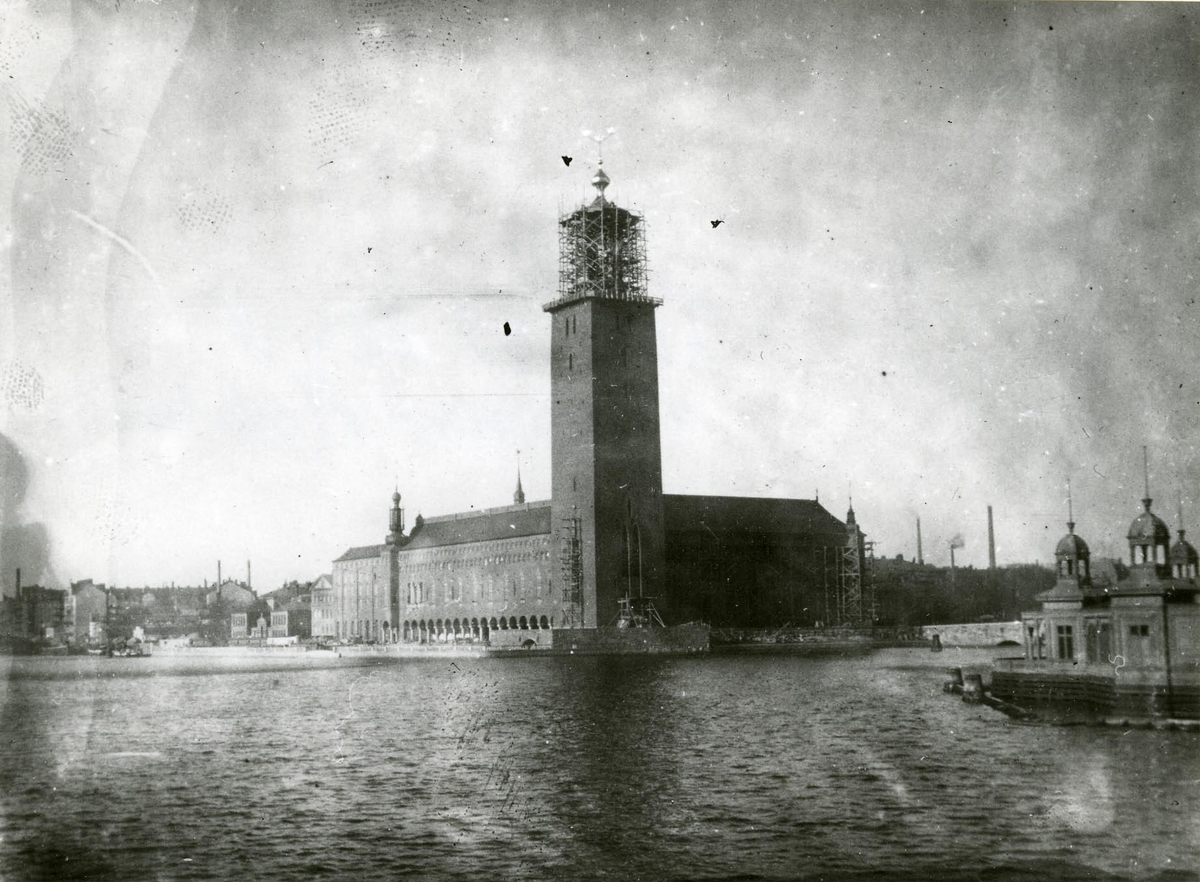 Stockholms Stadshus under färdigställande. T.h. "Gjörkes" bad som låg i vattnet öster om Vasa-bron.