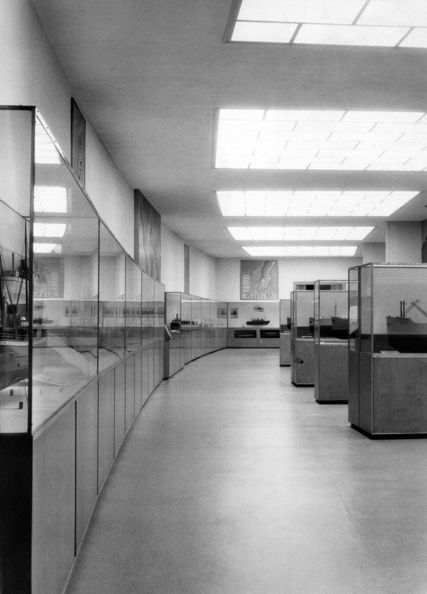Utställning i Moderna avdelningen i Sjöfartsavdelningen. Montrar med fartygsmodeller.