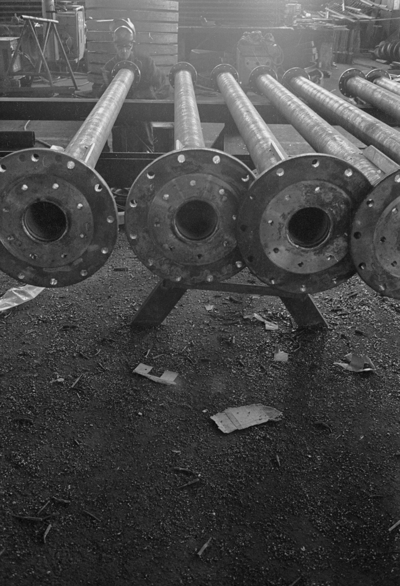 Ekensbergs varv. Verkstadsinteriör, arbetsstycken för svetsning.