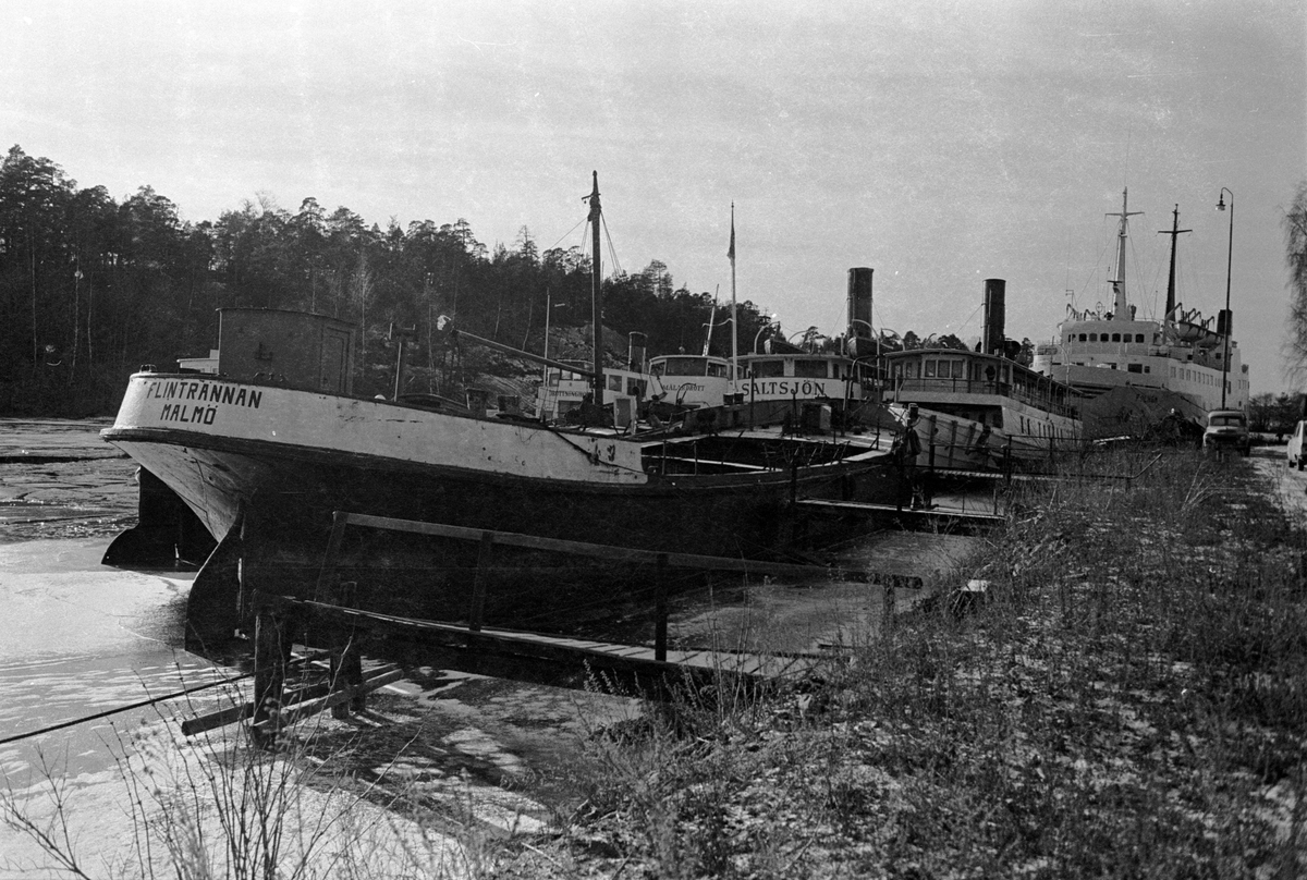 Fartyg vid Ekensbergs varv 1970. Närmast transportpråmen, f d bogserbåten FLINTRÄNNAN. I bakgrunden fr v t h DROTTNINGHOLM (urspr. VALKYRIAN), MÄLARDROTT (urspr. GRISSLAN), SALTSJÖN (1925) och ÖSTANÅ I (1906). Längst bak ses Gotlandsfärjan POLHEM (urspr. KRAAKERØ).