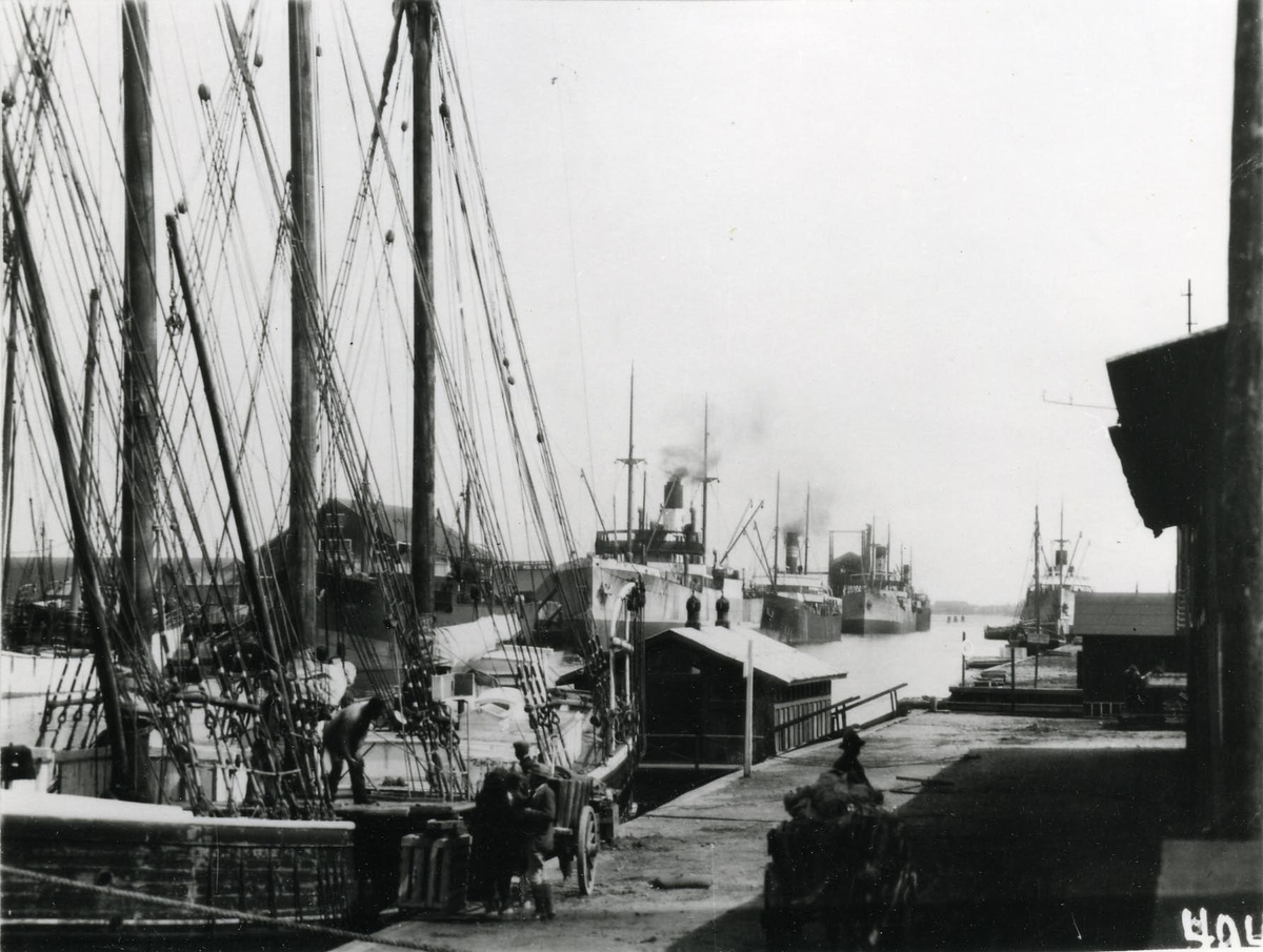 Gävle - del av hamnen. I mitten ett klapphus. I bakgrunden Lantmannaförbundets sädesmagasin.