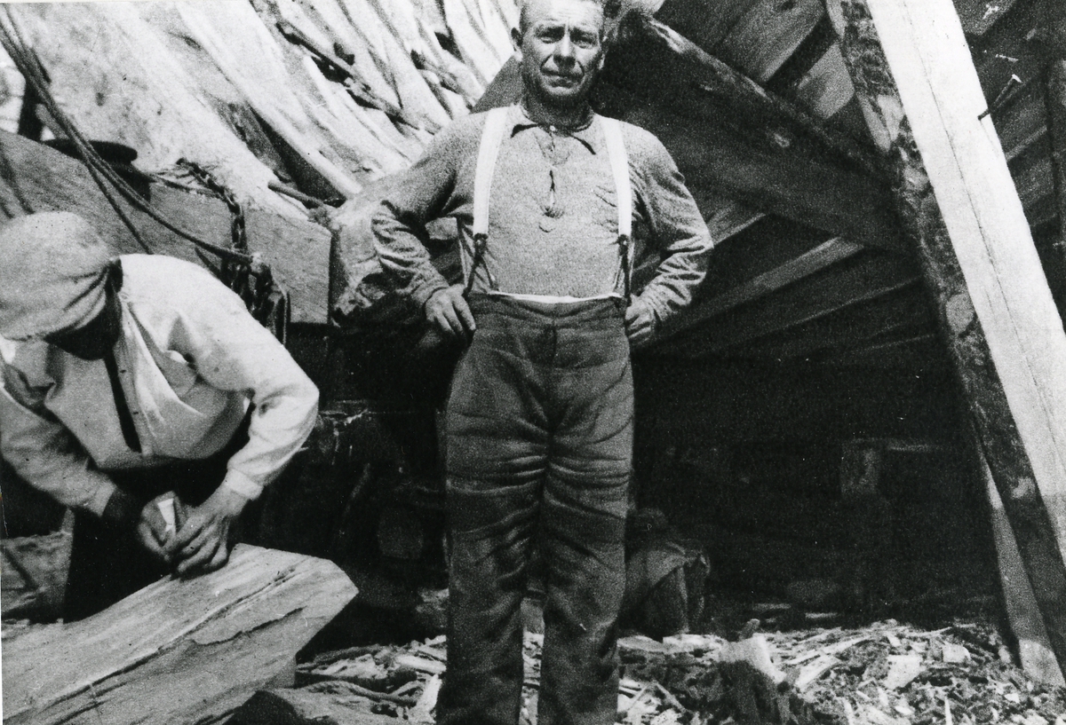 Skeppsbyggmästaren Peeter Sepp "som byggt ett stort antal fartyg, bl.a. fyrmastskonaren TORMILIND". I bakgrunden motorseglaren JUHAN under byggnad.