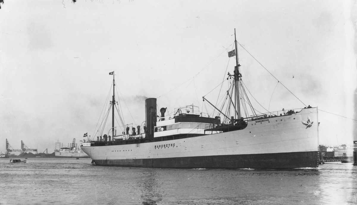Foto i svartvitt visande last- & passagerarångfartyget "MARGRETHE" av Aalborg i Köpenhamn, troligen under 1930-talet.
