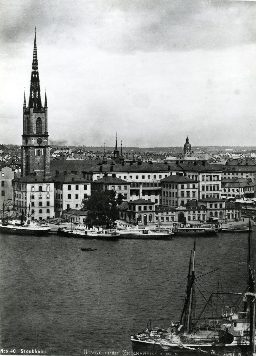 Utsikt från Skinnarviksbergen mot kajen på Riddarholmen med ångbåtar.
