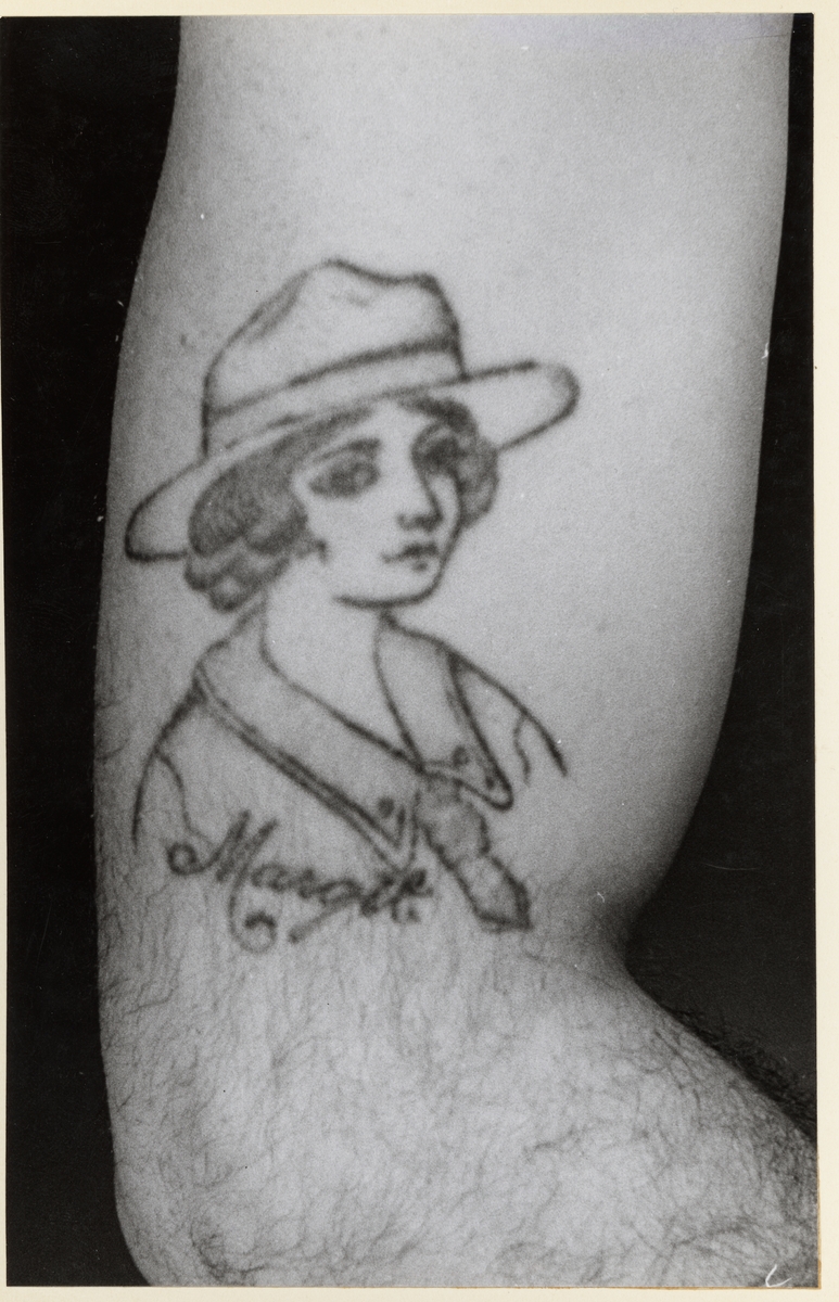Margit var en flicka som B. kände. Hon var scout. Tatueringen utförd i Göteborg av "Kalle" 1925.